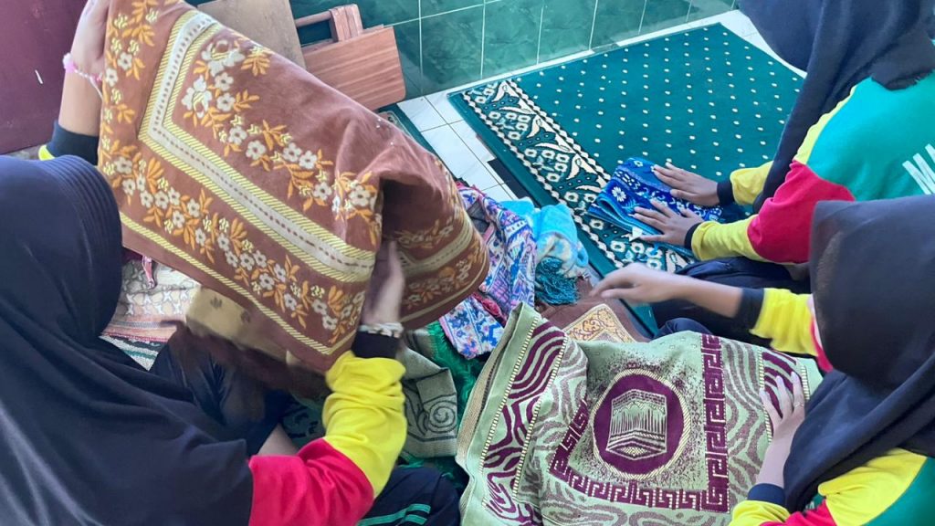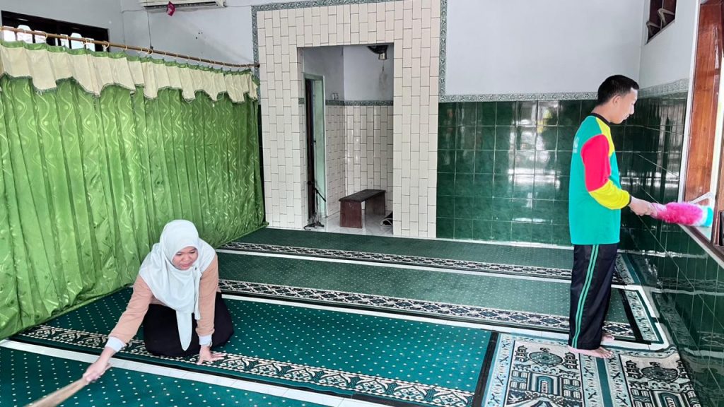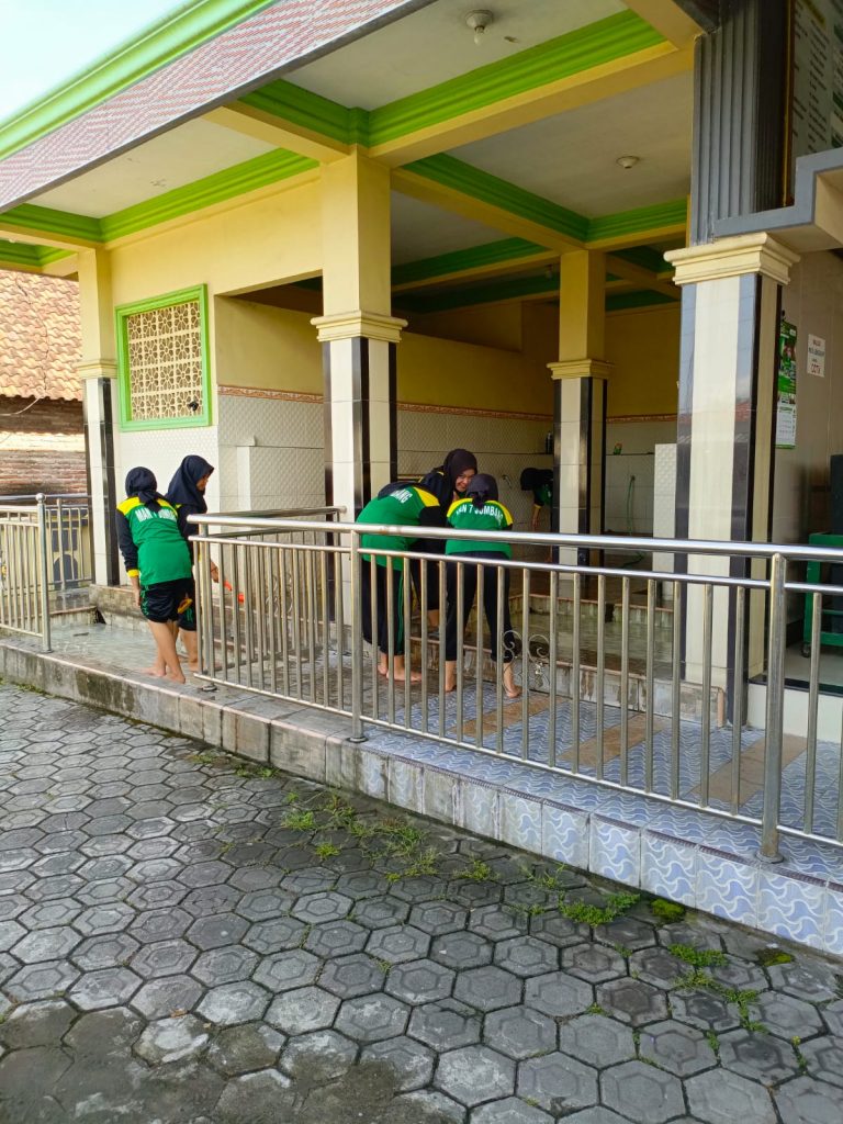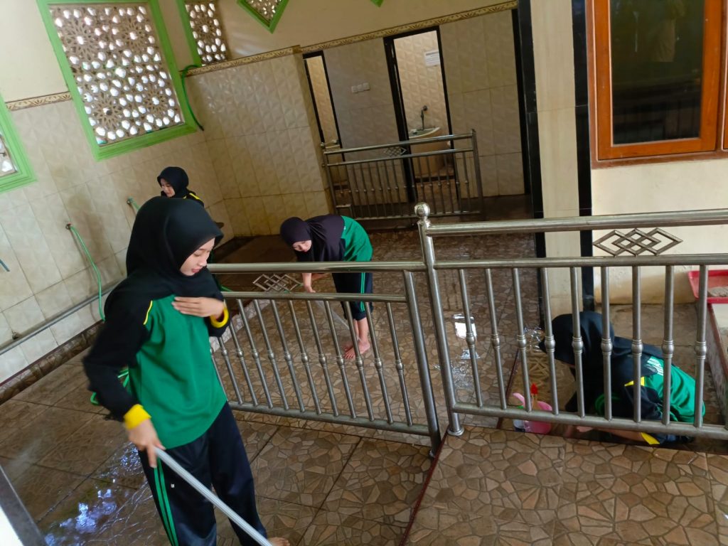 Kegiatan berlangsung dengan penuh semangat dan kebersamaan. Gotong royong yang terjalin mencerminkan nilai ukhuwah Islamiyah serta kepedulian sosial para peserta didik terhadap lingkungan ibadah masyarakat.