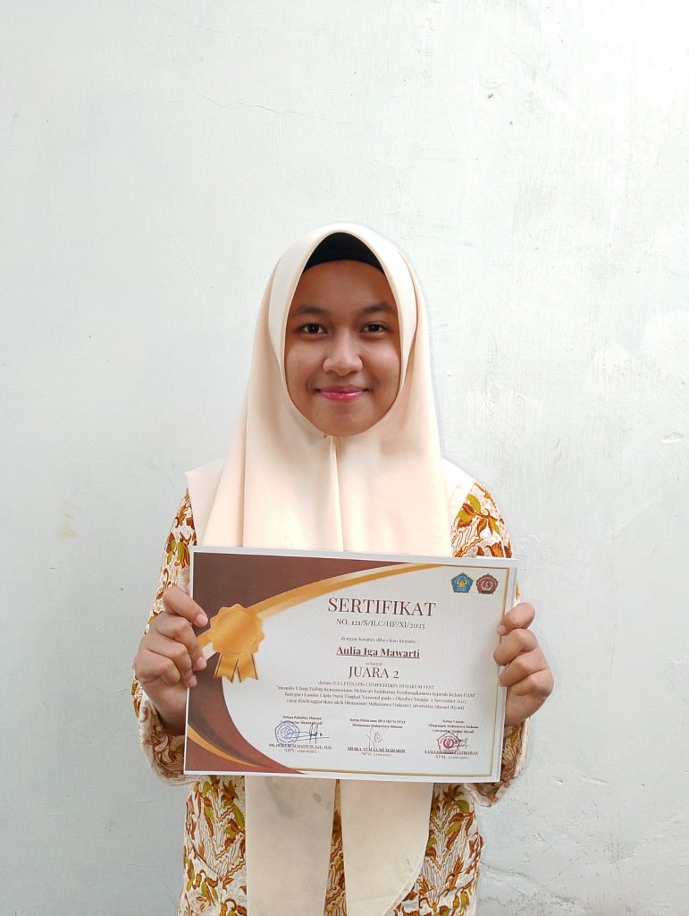 Prestasi membanggakan kembali diraih oleh peserta didik MAN 7 Jombang. Kali ini datang dari Aulia Iga Mawarti (XI E) siswi berbakat yang berhasil meraih Juara 2 dalam Lomba Cipta Puisi Tingkat Nasional yang diselenggarakan oleh Himpunan Mahasiswa Hukum (HIMAKUM) Universitas Slamet Riyadi (UNISRI) Surakarta (01/11/2025).
